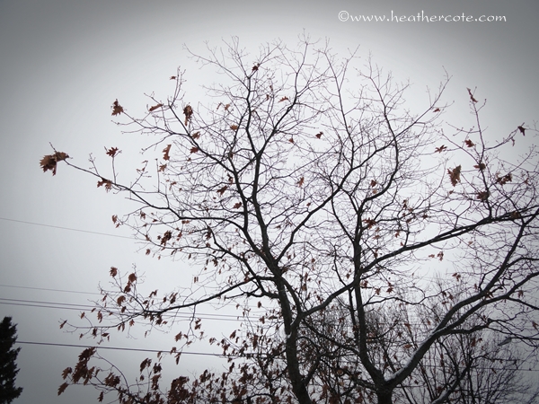 this tree is in my front yard and I noticed last winter the stately old fellow holds on to it’s leaves for as long as it can! Here it is January 4th., and he still has many flapping in the wind…as you can see a bit of a gloomy day…
