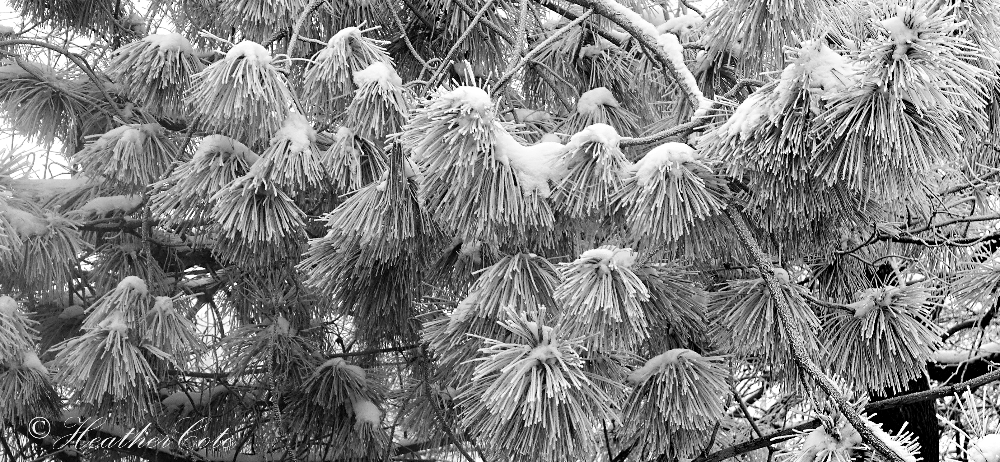 Photo was taken from my back deck(gray-scale)…it is somewhat foggy outside…which is creating “freezing fog”…http://www.theweatherprediction.com/habyhints/359/ As you can see, the needles on this tree are weighted down…